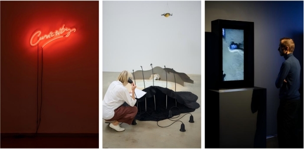 (左)Marta Frėjutė, Curiosity, 2022. Neon lamp, 35 x 75 x 6 cm. Photo by A. Vasilenko. Courtesy of the artist and Meno Parkas Gallery;(中)Installation view of when meandering through the sunken echoes, when drifting through the fleeing hollow by Alexis Wong, 2025. Mixed‑media interactive installation, size variable. Photo by Ian Wallman. Courtesy of the artist and Yiwei Gallery; (右)Installation view of Transenlight–Four Emissaries by Jansword Zhu, 2024. Video art installation, stainless steel, 1’52”, 104.8 × 72 × 60 cm. Courtesy of the artist and Astra Art.